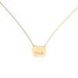 Luxusný šperk s puncom absolútnej módnosti. To je minimalistický retiazkový náhrdelník ALOve z bieleho, žltého alebo ružového zlata s pozdĺžnym obdĺžnikovým príveskom s nápisom zdobeným žiariacim diamantom.