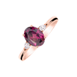 Klasický design zásnubního prstenu v moderním provedení. Oválný centrální rhodolit je po stranách zdoben dvěma menšími diamanty, což vypadá opravdu úchvatně.