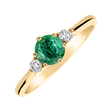 Luxusný prsteň s centrálnym smaragdom je z každej strany doplnený čírym briliantom. Jemná obrúčka je vyrobená zo 14-karátového žltého zlata. Šperk je úžasný ako zásnubný prsteň alebo očarujúci darček.