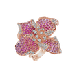 Diamanty, zafír a presnosť. 18kt prsteň z ružového zlata s diamantmi a zafírovou ružovou farbou je majstrovským dielom ručnej práce a ozdobou pre tých, ktorí poznajú hodnotu skutočnej krásy a sily. Šperk je súčasťou kolekcie Flowers.