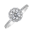 Šperk, ktorý očarí každú ženu. Úchvatný prsteň z bieleho 14-karátového zlata v dizajne halo s centrálnym diamantom obklopeným drobnými briliantmi.