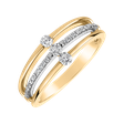 Tento neprehliadnuteľný prsteň zo 14kt zlata tvoria tri lesklé línie z briliantov a zlata. Stredu dominujú tri diamanty, ktoré očarujú svojimi iskrivými odleskami. Tento nadčasový a moderný šperk z vás urobí skutočnú dámu.