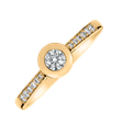 Elegantný diamantový prsteň zo žltého zlata je skvelá voľba pre žiadosť o ruku, ale aj nádherný darček. Minimalisticky okrúhly dizajn centrálne vsadeného kameňa je zvyraznený žiarivými briliantmi po stranách.