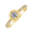 Elegantný diamantový prsteň zo žltého zlata je skvelá voľba pre žiadosť o ruku, ale aj nádherný darček. Minimalisticky okrúhly dizajn centrálne vsadeného kameňa je zvyraznený žiarivými briliantmi po stranách.