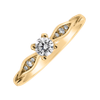 Neobvykle tvarovaný prsteň zo 14-karátového bieleho zlata zdobí centrálny diamant a po oboch stranách ho dopĺňajú menšie diamanty s originálnym osadením. Prsteň je ideálnou voľbou ako výnimočný zásnubný prsteň.