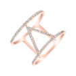 Luxusný prsteň z ružového 14kt zlata tvoria dva krúžky spojené tvarom písmena V, ktoré zdobia trblietavé diamanty. Prsteň je vďaka svojmu dizajnu výrazný a zaručene neprehliadnuteľný.