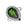 Prsteň vyrobený z 18kt bieleho zlata s diamantom, turmalínovou zelenou a rubínom, ktorý sa môže pochváliť svojou dokonalosťou a starostlivo vybranými kameňmi, je symbolickou pečaťou večnej elegancie. Šperk je súčasťou kolekcie Diana.